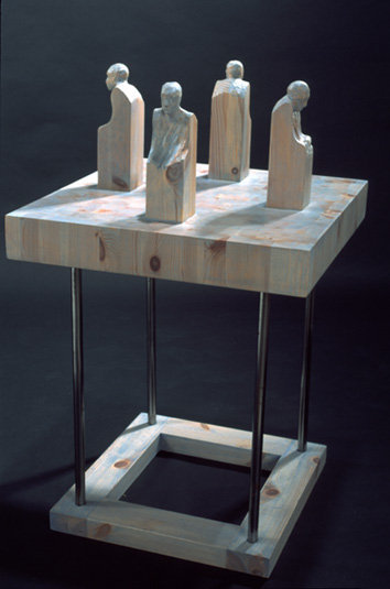 "4" 2001 (mänty, vernissa, pigmentti, vaha, huonekaluputki) Koko: 110cm x 65cm x 65cm